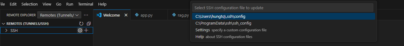 Hover mouse to SSH line > Click setting to config and choose your local config (ex: c:\users\{username}\.ssh\config)